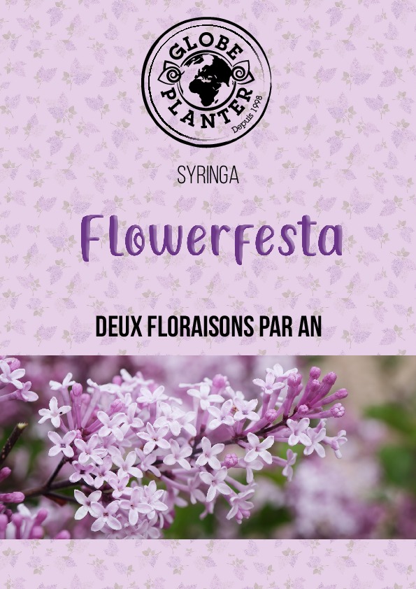 FLOWERFESTA® est une série composée de variétés de Syringa meyeri aux fleurs plus grandes que l'espèce. Ces plantes fleurissent deux fois dans l’année, au printemps et au début de l’automne, et comme l’espèce type, elles sont résistantes au froid et peuvent s’adapter aux petits espaces en massifs mais également en pot et en bac.