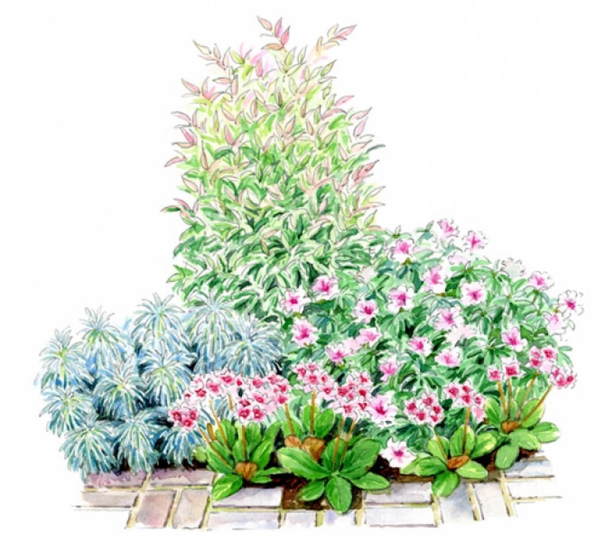 - Disposez en toile de fond le nandina puis, en avant et d'un côté, le sarcococca. Complétez avec en avant-plan, les sedums qui seront installés en quinconce.