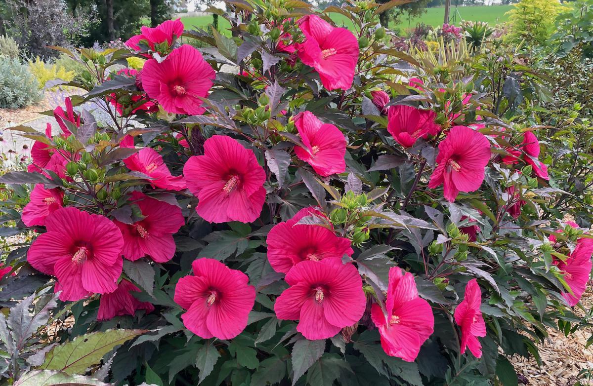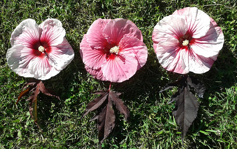 Les hibiscus moscheutos sont des vivaces aux tiges dressées dont les fleurs peuvent atteindre une envergure de 25cm. Une telle envergure équivaut au diamètre d’un disque vinyle, d’un ballon de football, d’une petite pastèque ou de la tête d’un bébé !