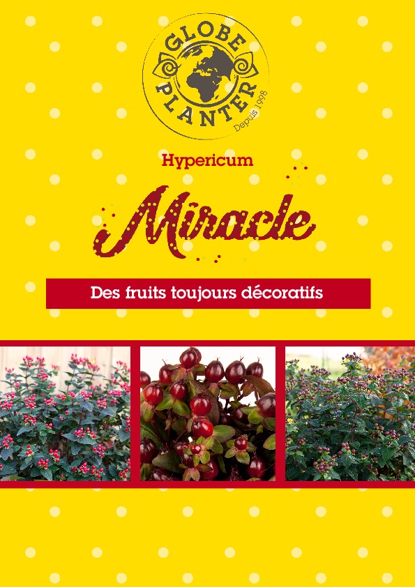 La série MIRACLE® est composée de plantes aux gros fruits colorés et aux feuillages toujours frais et brillants. Les premières fleurs apparaissent en fin de printemps et donnent naissance à une fructification abondante en bouquets. Les fleurs sont toujours jaunes mais les couleurs des fruits diffèrent selon les variétés. Les Hypericum MIRACLE® se plaisent dans tous les sols et toutes les expositions. Les plantes ne sont pas sensibles aux maladies et résistent bien aux aléas du climat. Elles se plaisent en massifs comme en pots ou en bacs.
