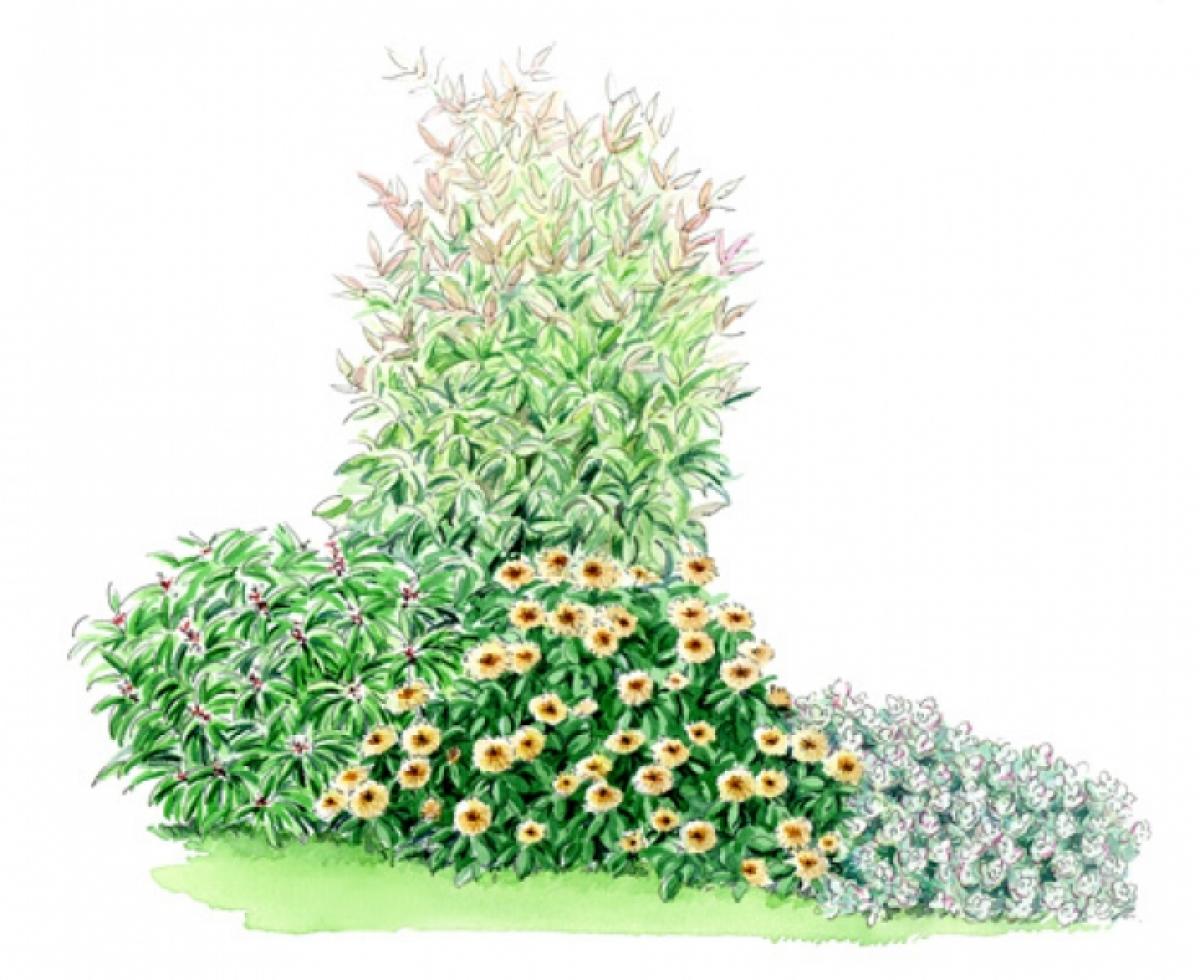 Quantité : 1 Nandina 'Twilight', 1 Euphorbe characias 'Glacier Blue', 3 Azalées ENCORE ® 'Sweetheart'.