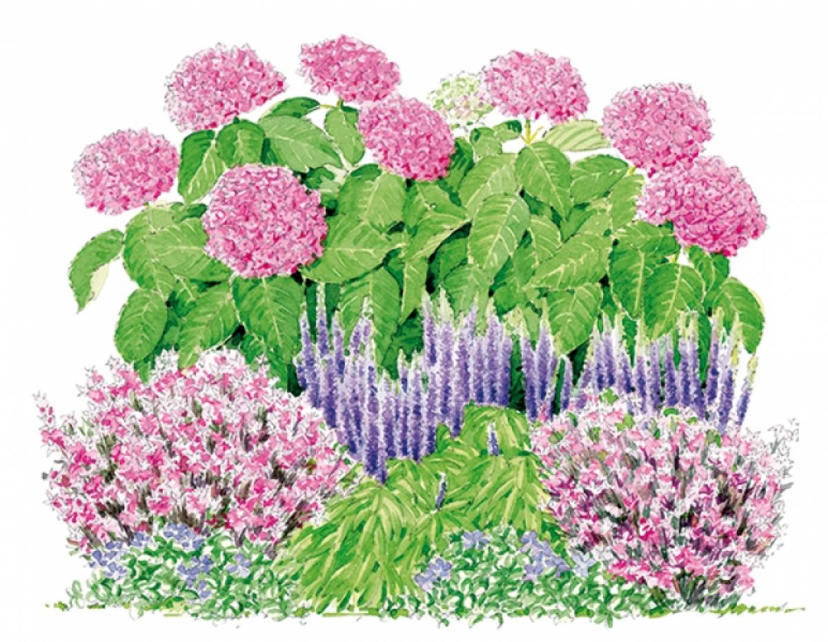 - Occupez le fond de cette scène avec les trois hortensias plantés en quinconce. Au centre, installez les véroniques bleues puis, en avant-plan, au centre, les pervenches panachées. De part et d'autre, sur le devant, complétez avec les gauras roses.